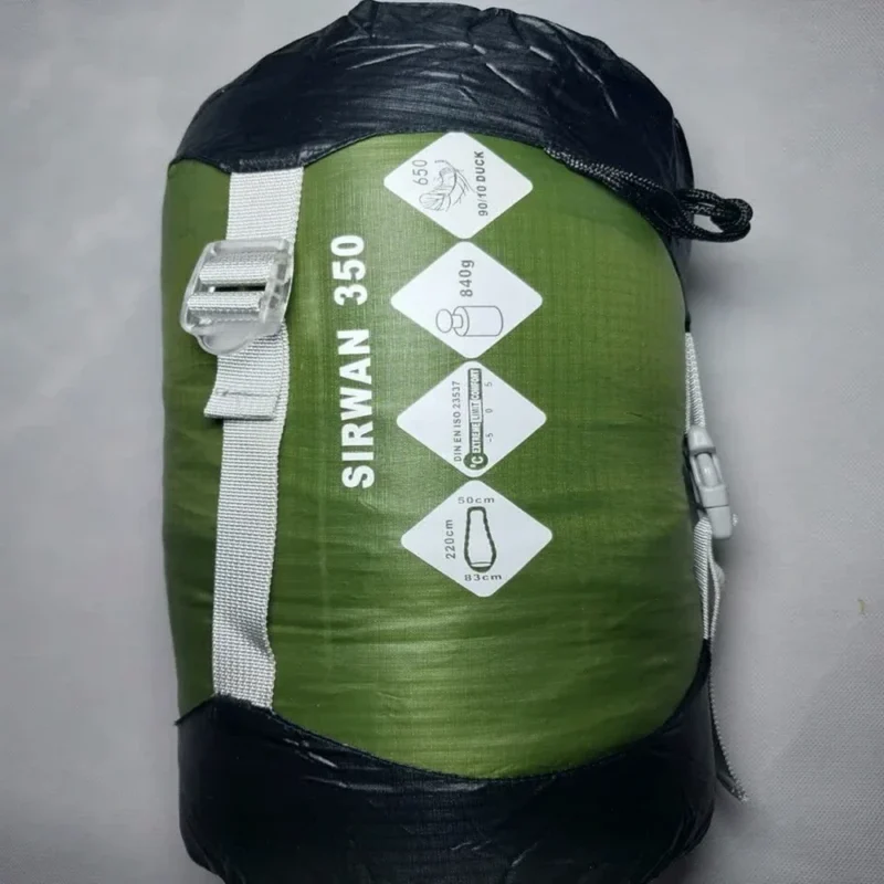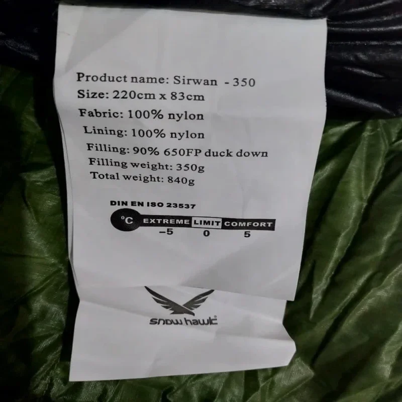 کیسه خواب اسنوهاوک مدل سیروان 350 کیسه خواب های سری Sirwan جدیدترین کیسه خواب های تولید شده توسط کمپانی Snow Hawk می باشد. که در سه مدل 350 ، 700 ، 900 و با مرغوبترین نوع پر اردک این کمپانی تولید شده اند. این کمپانی در ساخت کیسه خواب اسنوهاوک مدل سیروان Sirwan 350 از پر اردک با تراکم 90/10 استفاده نموده است. و همین تراکم بالا سبب گشته است تا این کیسه خواب با داشتن تنها 840 گرم وزن به یکی از سبک وزن ترین کیسه خواب موجود در این بازه ی دمایی تبدیل گردد.